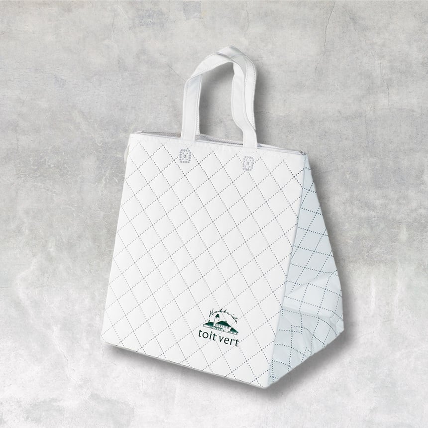白を基調とした、清潔感のあるキルティングデザインの保冷バッグです。お買い物やアウトドアに使いやすいサイズで、トワ・ヴェールのロゴがワンポイントになっています。